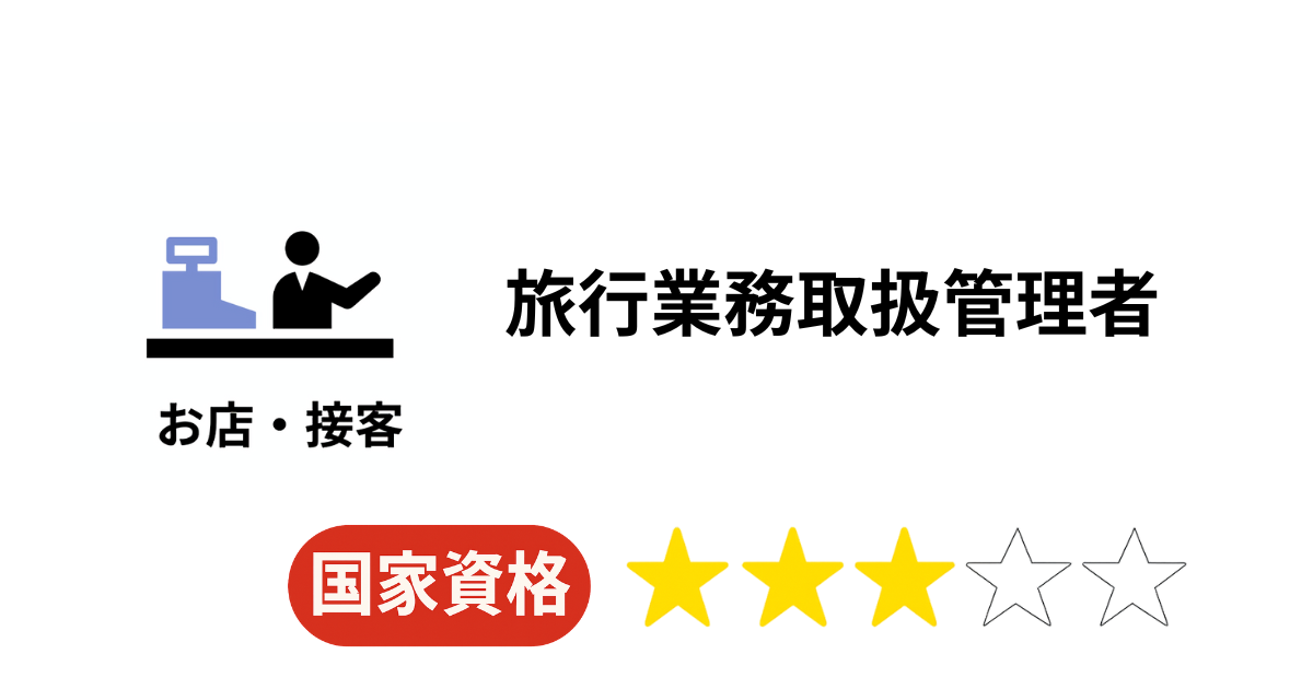 | 登録要件 | 試験合格後、旅行業登録を行う際に「旅行業務取扱管理者」として営業所に1名以上配置することが法律で義務づけられている。 |